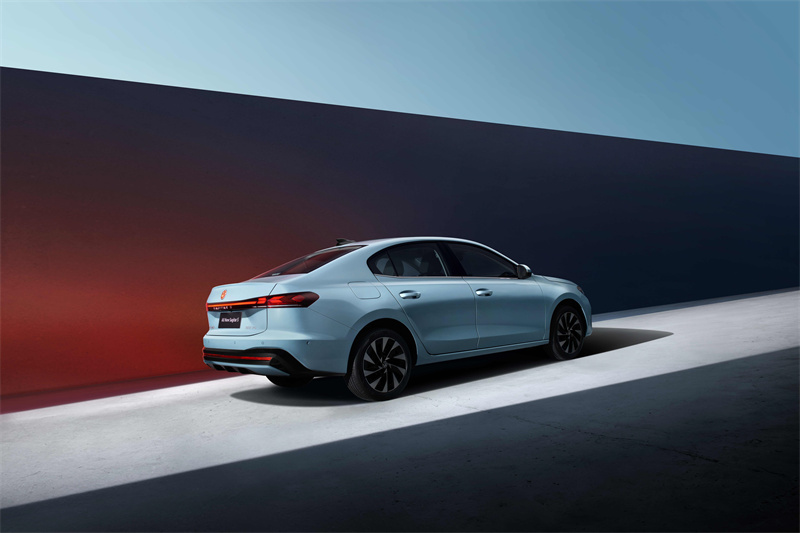 車身側面,新車嚴格遵循“家用黃金比例”,簡潔整體的特征線配合舒展的型面變化,營造出越級的高級感。溜背式造型搭配微微上翹的“小鴨尾”設計,在保證后排頭部空間的同時,勾勒出動感流暢的尾部線條。