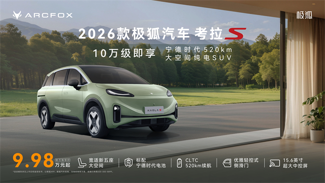 1月13日,2026款極狐汽車考拉S正式上市,共推出520 AIR、520 PRO、520 MAX三個版型,官方指導價分別為9.98萬、10.98萬、11.98萬。同時,新車給出“8年或15萬公里電池衰減超限值只換不修、電池自燃燒一賠一、三電終身質保”三重守護承諾,更誠意放送“價值3999元充電樁抵扣券、5年或12萬公里整車質保、終身免費OTA升級”等6大尊享權益,讓用戶購車用車輕松無憂。