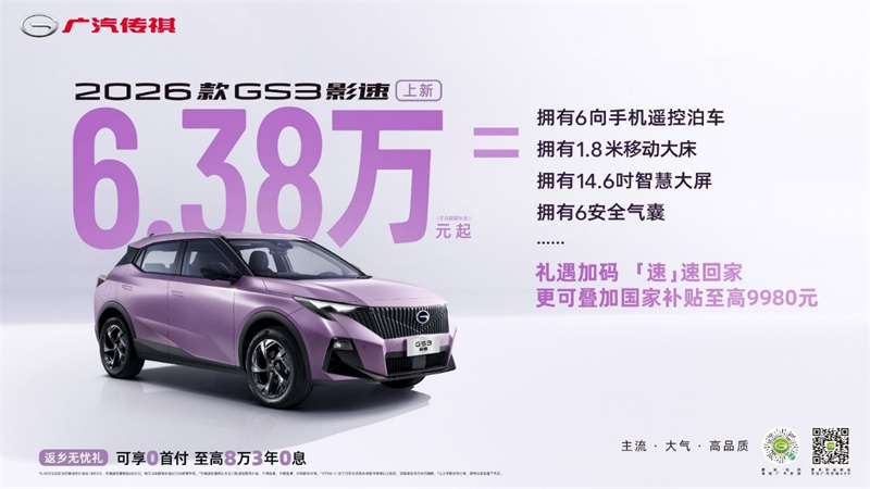 臨近春節(jié),返鄉(xiāng)團(tuán)圓早已是刻在DNA里的溫情期盼,此時,一輛可靠的座駕不僅是跨越千里的“底氣”,更是承載全家歡笑的移動港灣。放眼7萬級小型燃油SUV市場,傳祺GS3影速可以算是消費者心中的“不二之選”,當(dāng)面臨 “載家人、裝年貨、跑長途、闖鄉(xiāng)道、停窄位” 這場春節(jié)返鄉(xiāng)的綜合性“大考”時,影速能否可以面面俱到,從容應(yīng)對?