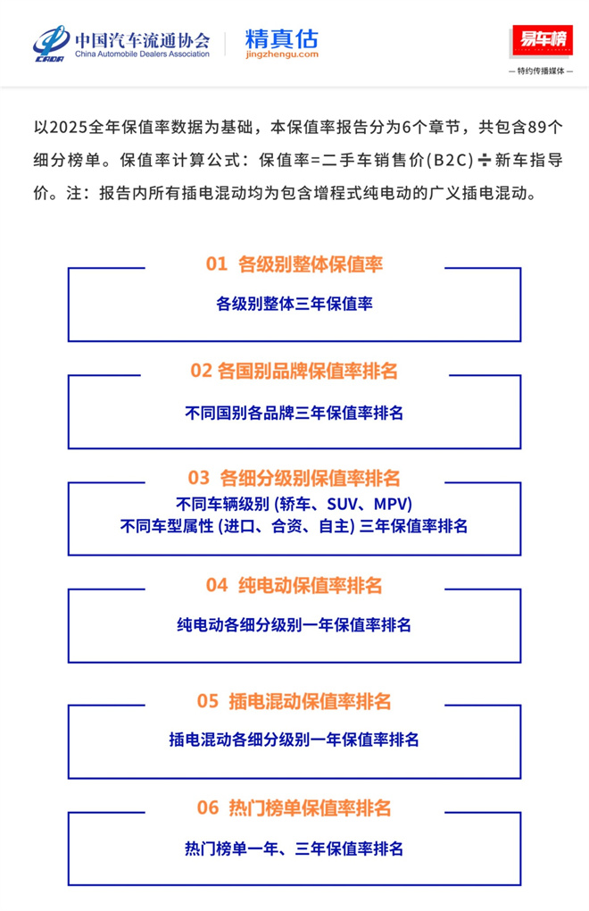 在此行業背景下,中國汽車流通協會與精真估即將聯合發布2025年度中國汽車保值率報告(后簡稱“報告”),騰易科技旗下易車榜憑借強勁的行業影響力與傳播力,成為本次報告的特約傳播媒體。作為報告數據體系的重要組成部分,易車榜提供專業數據參考的同時,也讓權威行業數據通過多元渠道觸達更廣泛受眾。
