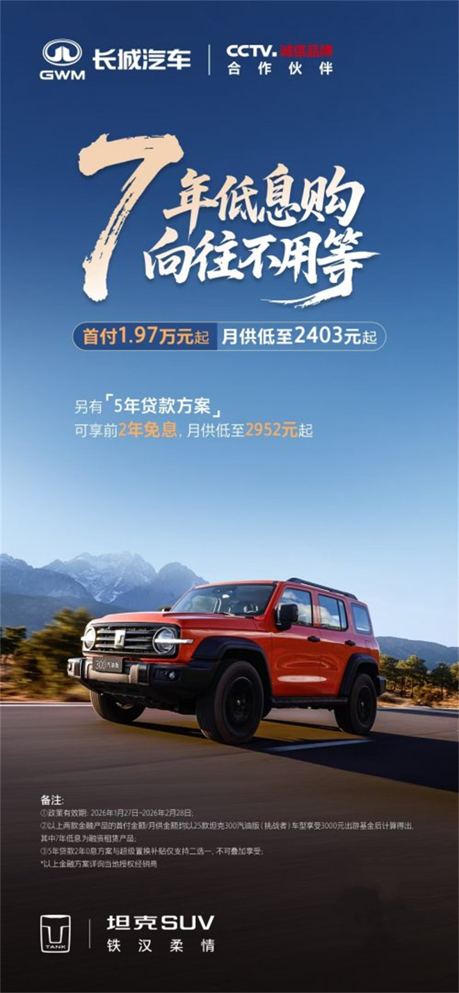 開年一刻,必有坦克。即日至2026年2月28日,坦克品牌正式推出“7年低息”和“5年貸款前2年免息”(下稱“5免2”)金融購車政策,首付最低1.97萬元起,日供不過百元的靈活輕松方案,助你用更低門檻,通過越野路上更高溝溝坎坎,讓夢想就此輕裝上路。