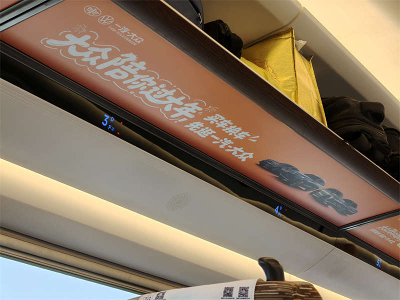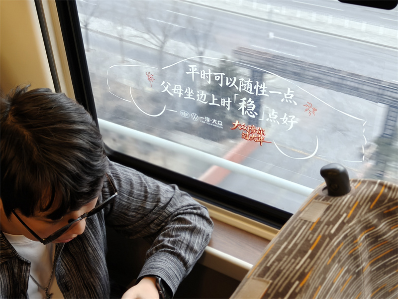 不止窗花吸睛,整列列車都藏著小驚喜!行李架上的一汽-大眾品牌廣告,用大字報式的趣味表達打破刻板印象,簡潔有力又自帶記憶點;趣味天幕與車廂布置相映成趣,讓原本單調的高鐵旅途,變成了沉浸式的新春打卡現場。不用刻意尋找,目之所及皆是年味,隨手一拍都是氛圍感大片,讓趕路的人忍不住停下腳步互動分享,把旅途的美好定格。