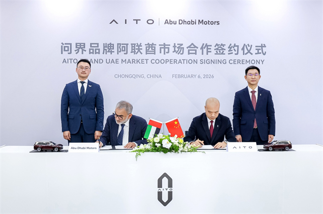 2026年2月6日,中國豪華汽車引領(lǐng)者AITO問界與阿聯(lián)酋頭部豪華汽車經(jīng)銷商集團(tuán) Abu Dhabi Motors(以下簡稱 ADM)在中國重慶正式簽署戰(zhàn)略合作協(xié)議。賽力斯汽車海外BU總裁王進(jìn)與ADM CEO Syed Faiz Karim 代表雙方簽署協(xié)議,賽力斯汽車總裁何利揚(yáng)與阿卜杜拉·本·穆罕默德·本·布蒂·阿勒哈米德閣下私人辦公室中國區(qū)負(fù)責(zé)人趙頔見證簽約。這次合作標(biāo)志著AITO問界在海外高端新能源市場的布局取得關(guān)鍵進(jìn)展,正式開啟品牌全球化的新篇章。