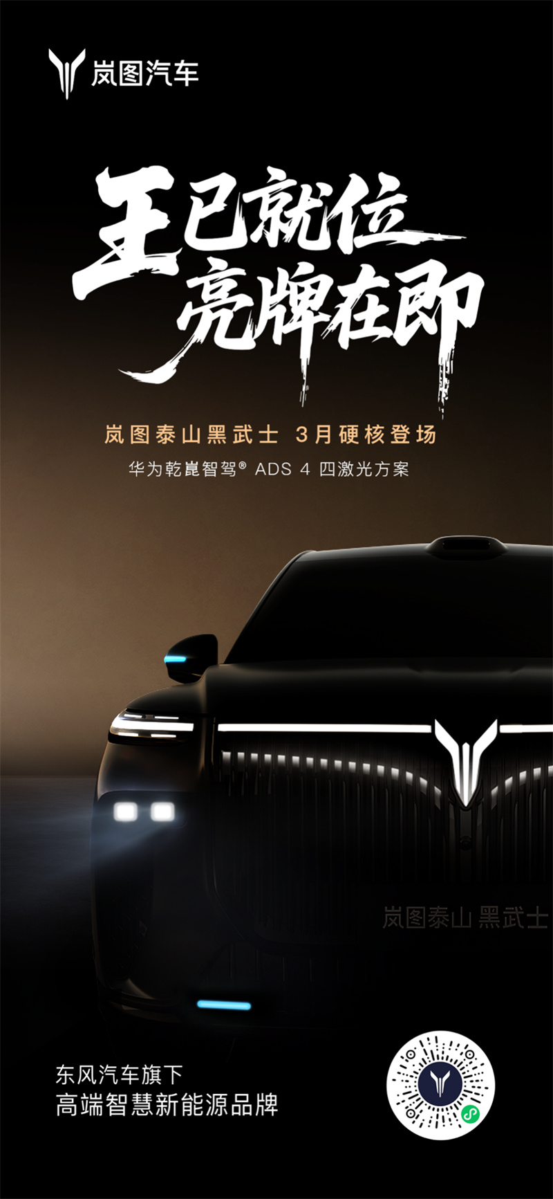 2月9日,嵐圖汽車官方社交平臺發布視頻,正式宣布嵐圖泰山黑武士版將于今年3月登場,采用限定發售策略。