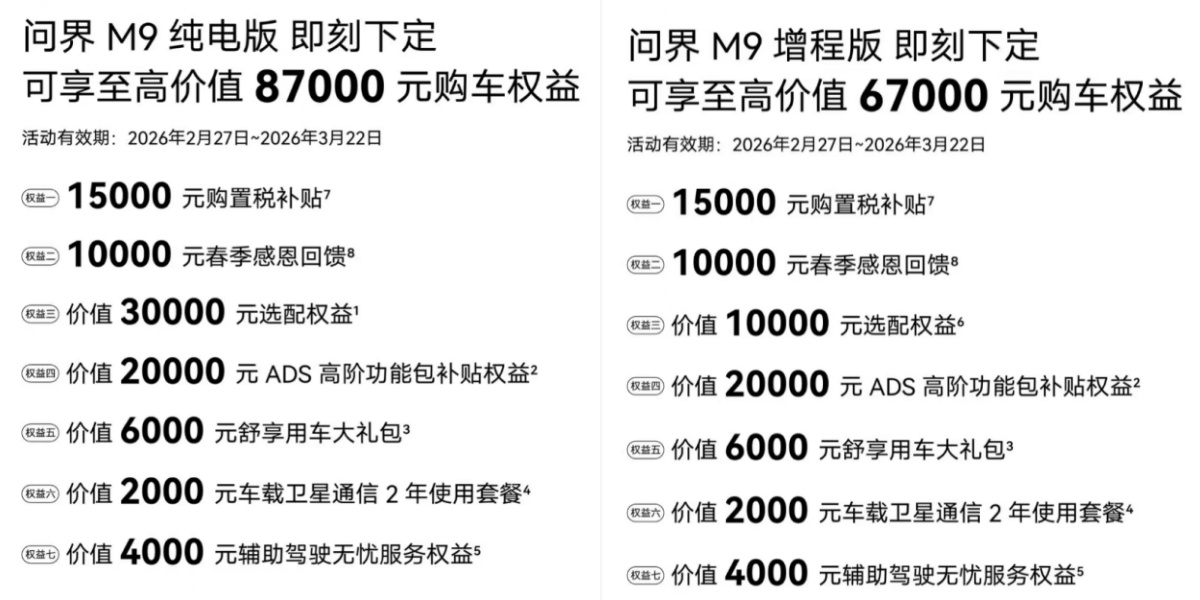 值此春日出行季,問界M9更推出限時購車重磅禮遇。即日起至3月22日,下定問界M9至高可享87000元購車權益,涵蓋購置稅補貼、春季感恩回饋及ADS高階功能包補貼等多重福利,以真金白銀的優(yōu)惠,讓觸手可及的科技豪華,陪伴每一位用戶奔赴春日山海,解鎖更多出行美好。