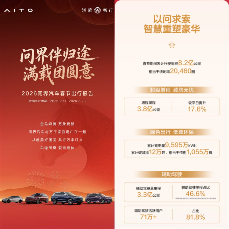 這個春節,問界用數億公里的陪伴,溫暖每一段奔赴團圓的歸途;用7萬余次主動守護,詮釋了“安全是最大的豪華”;用春節不打烊的服務,讓用戶出行更省心、舒心和開心。智慧護航歸途,愛意照亮前路,展望2026,問界汽車將攜手每一位用戶,持續探索智慧出行新體驗,與萬千家庭共赴美好新程。