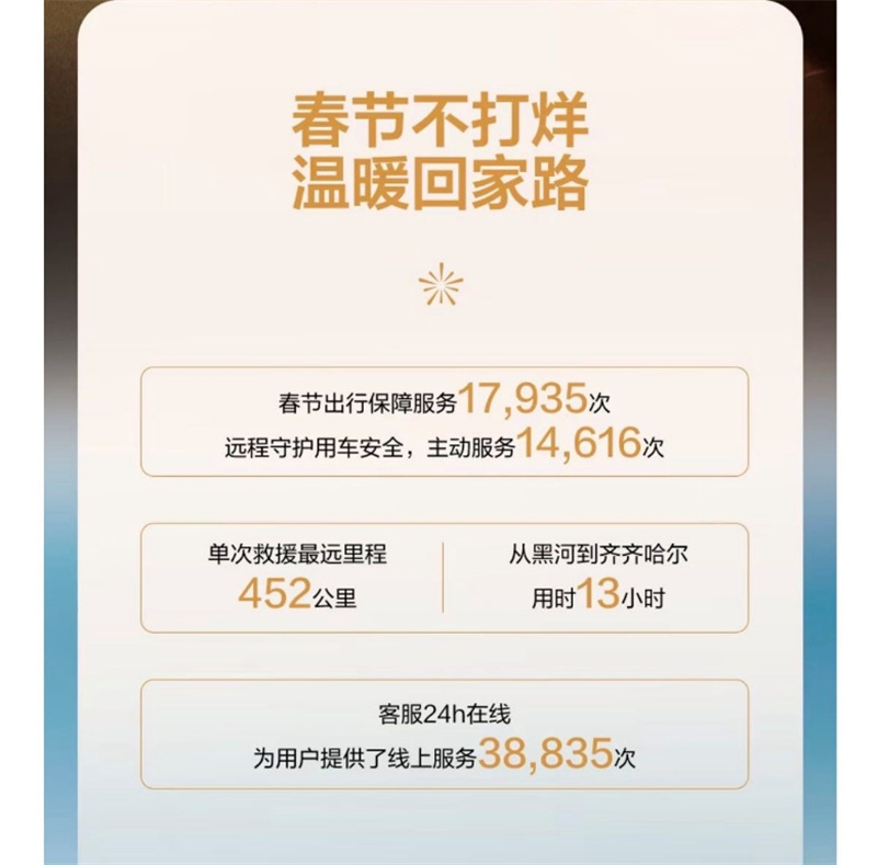 春節期間,問界共提供出行保障服務17,935次;遠程守護用車安全,主動服務14,616次,將許多潛在故障消弭于無形。客服中心24小時在線,為用戶提供了線上服務38,835次。為保障用戶在遭遇緊急情況時能獲得及時且高效的援助,問界服務網絡展現了強大的跨區域協同能力,單次救援最遠里程452公里,從黑河到齊齊哈爾用時13小時,樹立了新豪華服務標桿。