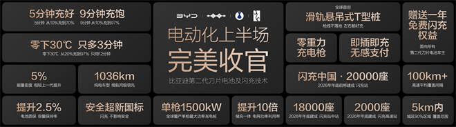 安全標準超新國標,閃充不影響電池安全。能量密度比上一代提升5%,純電續航干到1036km,質保容量保持率再提2.5%。