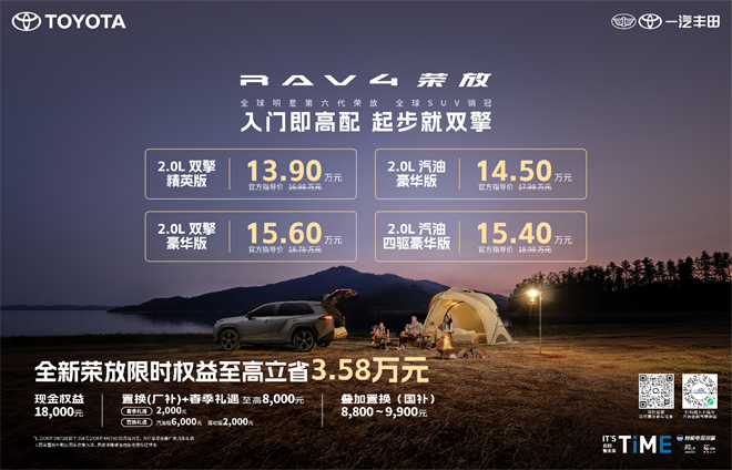 驚喜不止于價格,還有重重福利。2026年3月31日前下訂榮放全系并在4月30日前開具發(fā)票的用戶,即可享受一汽豐田提供的包括春季禮遇和置換補貼在內(nèi)的至高8000元春日禮。這還不夠,用戶還可同步享受至高約萬元的國家補貼。