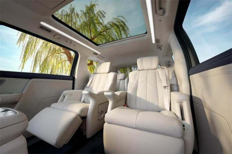 舒適配置拉滿,三排全粒面Nappa真皮座椅,二排多姿態(tài)零重力座椅支持聯(lián)動(dòng)貴妃榻,8場(chǎng)景指壓式按摩,長(zhǎng)途乘坐不疲憊。云臺(tái)式超低空氣懸架,車身降低60mm,355mm超低門檻,老人小孩上下車更便捷。