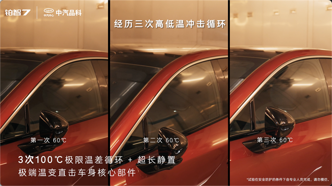 “整車極寒極熱循環沖擊”覆蓋-40℃到60℃的極限溫差,相當于從寒冬臘月的內蒙古牙克石,到七八月份的新疆吐魯番。3輪急劇、寬幅的溫度變化對車輛的電子電氣系統、密封件、內飾材料等都構成嚴峻考驗。測試后,車輛外觀無變形、車機功能操作全部正常。意味著中國境內任意氣溫環境變化都不會對車輛造成損壞。