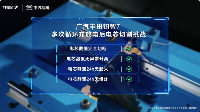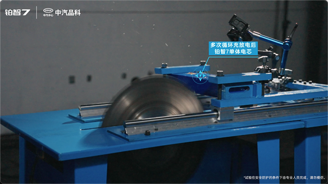 該測試分2輪進行,用于測試的2塊單體電芯,均處于100%滿電狀態,其中一塊為全新;另一塊則經過了800多次循環充放電、等效行駛里程超30萬公里。該測試為“全截面切割”,短路面積遠超常規的針刺測試。測試結果顯示,被切割的電芯溫度無異常升高,靜置24小時后無起火、無爆炸,這意味著,鉑智7在最嚴重事故發生后,即使電芯受損,車輛也沒有起火危險,確保乘員不受二次傷害;因救援需要而切割車輛時,同樣不必擔心切割觸及電芯而引發火情。
