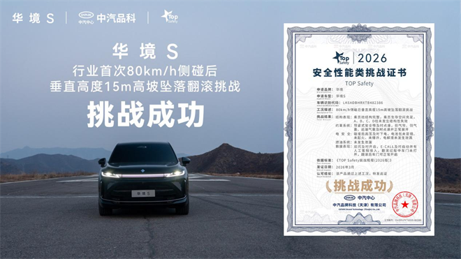 當高速側撞與墜坡翻滾兩大致命事故疊加,乘員能否安然無恙?2026年3月25日,上汽通用五菱與華為深化戰略合作的首款旗艦——華境S,公布行業首次 “80km/h側碰后垂直高度15m高坡墜落翻滾” 極限挑戰成果,憑借硬核安全實力成功通關 “超綱大考”,斬獲中汽品科 TOP Safety 安全性能證書,重新定義大六座 SUV 安全新標桿。