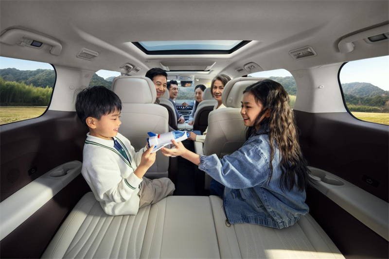 第二把鑰匙,是 “好坐”。它徹底告別了“二排獨寵,三排將就”的老毛病,堅持“全員舒適平權(quán)”。軸距3100mm,車內(nèi)純平地板,第三排再也不是“小板凳”,坐墊又長又厚,成年人也能舒展久坐。第二排的零重力航空座椅,獲得了權(quán)威認證,帶按摩、通風(fēng)、加熱,一鍵就能躺平。車里還有17.3英寸吸頂屏、智能冷暖冰箱,關(guān)上車門就是移動的私人影院和休息室。