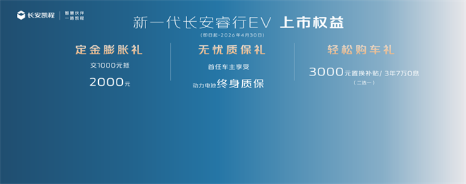 價格和權益,也挺給力!新一代長安睿行EM80(金鐘罩50kWh)8.09萬元起,EM60(金鐘罩50kWh)7.69萬元起。即日起到2026年4月30日,下訂能享三大權益!