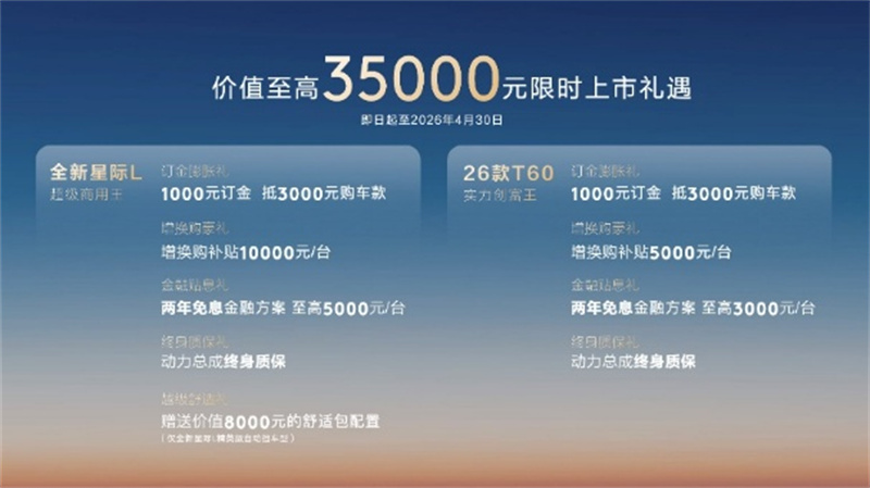 全新星際L,10.88-15.98萬元;26款星際EV,24.98萬元;26款T60,7.98-10.18萬元。三款車覆蓋商用創(chuàng)富、專業(yè)作業(yè)、日常通勤全場景。而且到4月30日前下訂,綜合權(quán)益至高3.5萬元。7萬出頭就能開走一臺(tái)正經(jīng)皮卡,這價(jià)格放在五年前,想都不敢想。