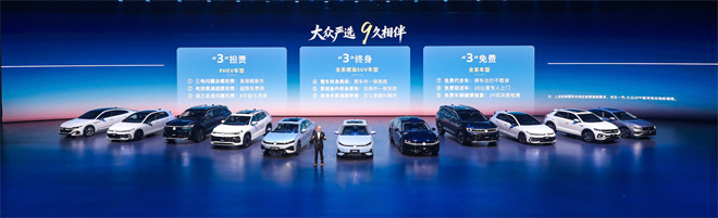 發(fā)布會(huì)同步推出“大眾嚴(yán)選9久相伴”專屬承諾,以“三擔(dān)責(zé)、三終身、三免費(fèi)”九大權(quán)益,覆蓋用車全生命周期,彰顯品牌責(zé)任與擔(dān)當(dāng)。