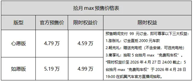 *限時權益價至2026年4月27日 24:00截止;5臺拾月max“免費購車權”于2026年4月28日19:00在凱翼汽車官方直播間抽取。