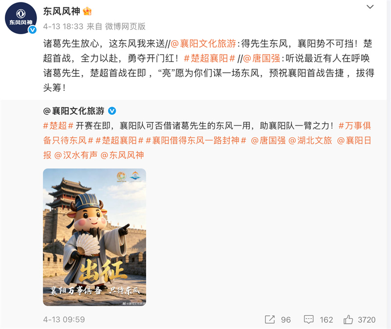 4月18日,湖北本土業(yè)余足球賽事“楚超聯賽”在襄陽打響首戰(zhàn)。17座城市、17支民間球隊展開角逐。然而比比賽本身更出圈的,是賽場邊一支特殊的“第18支隊伍”——東風風神。品牌聯合襄陽文旅,以“諸葛亮借東風”為創(chuàng)意內核,打造了一系列AI短劇,甚至引來經典諸葛亮扮演者唐國強本人在微博接梗,成功將一場地方業(yè)余聯賽推向全網熱議。