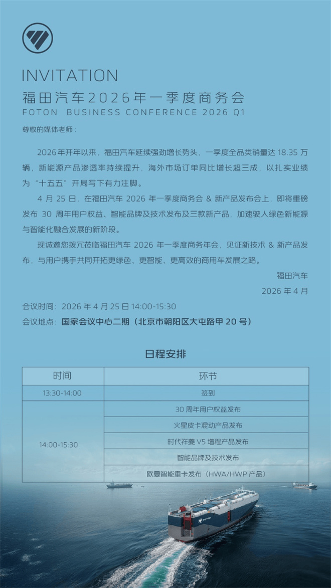 2026 年 4 月 25 日,福田汽車 2026 一季度商務會新產品發布會將在北京國家會議中心正式啟幕。本次發布會既是福田汽車一季度經營成果與戰略落地成效的集中展示,更是企業三十周年發展征程中的重要里程碑事件。作為一場匯聚行業目光、彰顯品牌實力的重磅盛會,發布會將圍繞感恩回饋、技術創新、產品升級三大核心,全方位呈現福田汽車在用戶生態構建、新能源技術研發、智能駕駛落地、全場景產品打造等領域的最新突破,為廣大用戶、經銷商合作伙伴及行業同仁帶來一場兼具科技感、價值感與未來感的商用車行業盛宴。