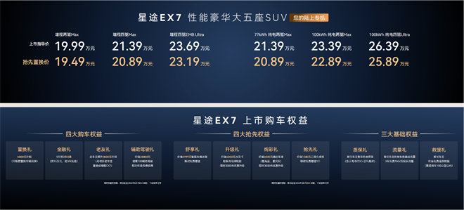 先看價格:19.99萬元—26.39萬元,搶先置換價最低能干到19.49萬。純電+增程雙動力,一共六款配置。說實話,這個價位段正好是國產高端SUV殺得最兇的戰場,理想L6、問界M7、比亞迪唐L都不是善茬。星途EX7憑什么殺出重圍?咱們來扒一扒。