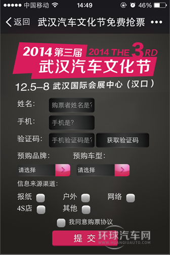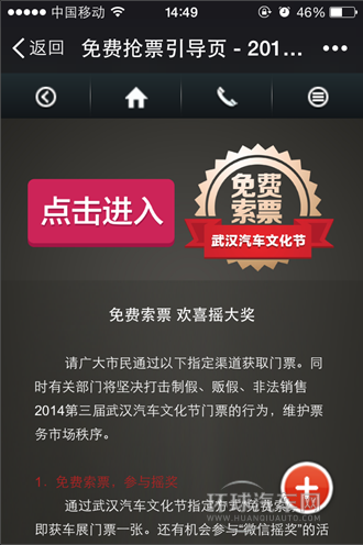 通過武漢汽車文化節(jié)指定方式“免費(fèi)索票”,即獲車展門票一張。還有機(jī)會(huì)參與“微信搖獎(jiǎng)”的活動(dòng),贏取品牌家電、生活用品等多重大禮!更多優(yōu)惠盡在車展現(xiàn)場(chǎng)!