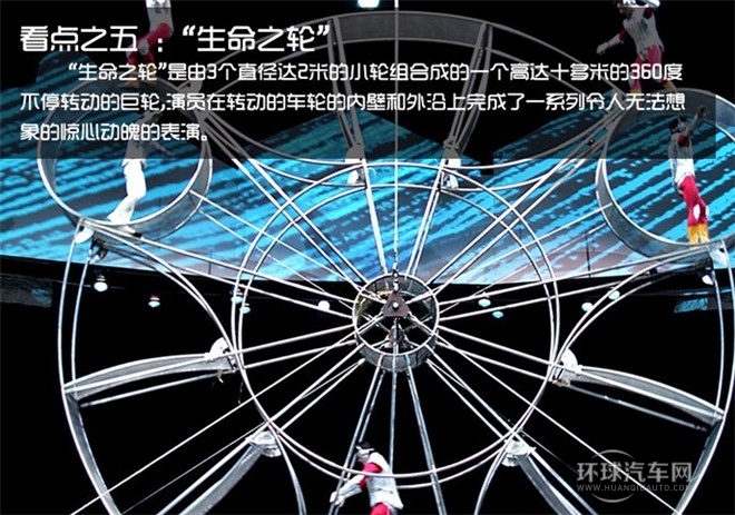 “生命之輪”是由3個直徑達2米的小輪組合成的一個高達十多米的360度不停轉動的巨輪,演員在轉動的車輪的內壁和外沿上完成了一系列令人無法想象的驚心動魄的表演,轉動的大車輪與背景上的多媒體投影交相輝映,層疊變幻,如時代的車輪滾滾向前、轉動不息、生命不止。