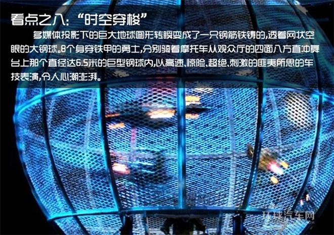 多媒體投影下的巨大地球圖形轉瞬變成了一只鋼筋鐵鑄的,透著網狀空眼的大鋼球。背景又轉換為五彩繽紛的都市景象,一部發動機的轟鳴打破了宇宙的寂靜。突然,巨大的轟鳴聲打破了平靜,8個身穿鐵甲的勇士,分別騎著摩托車從觀眾廳的四面八方直沖舞臺上那個直徑達6.5米的巨型鋼球內,以高速、驚險、超絕、刺激的匪夷所思的表演令人心潮澎湃。