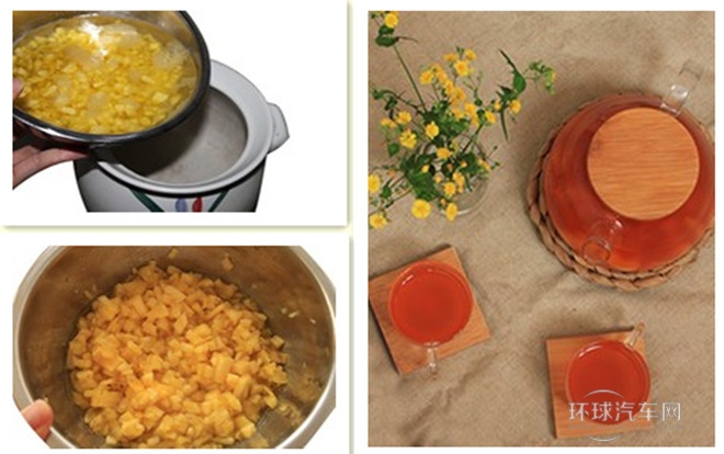 3. 做法:1.削皮后的菠蘿用鹽水浸泡5分鐘后,切成小塊,用糖腌制1小時;2.腌制好的菠蘿加水中火煮開后轉小火煮3分鐘;3.煮菠蘿時,沖茶;4.煮好的菠蘿連湯帶肉倒入茶壺,然后注入茶湯輕輕攪勻。