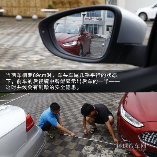 當兩車相距89cm時,車頭車尾幾乎平行的狀態下,前車的后視鏡中只能顯示出后車的一半——這時并線會有刮蹭的安全隱患。