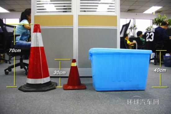 先介紹一下我們測量用的“障礙物”:模擬高柱體的大樁桶;收納箱模擬路邊石墩、蹲著玩的兒童;以及模擬小型障礙物的小樁桶。