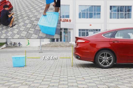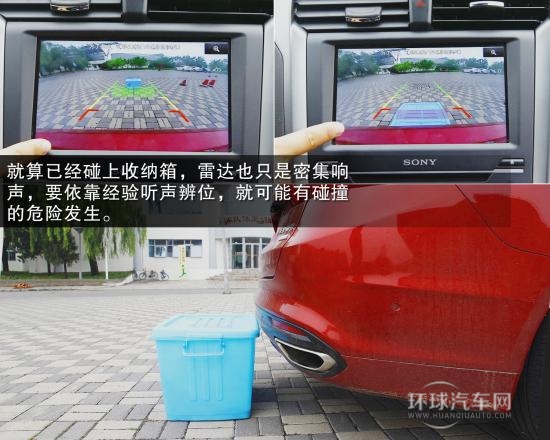 不過在面對收納箱時,倒車雷達就有點不知所措了,1.84米遠時就會檢測到它并提示。雷達提示聲與中控液晶屏上的顏色提示也會隨著距離而變化,不過一直到后保險杠貼上收納箱,雷達提示也只是很急促,而不是我們一般認為的會在碰上前就響成一片。