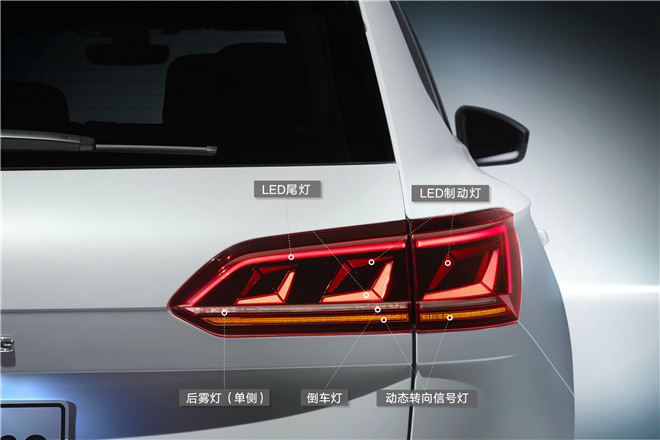 作為360°無死角的顏值擔當,途銳所采用的暗色高級LED后尾燈同樣是彰顯魅力的點睛之筆。包含LED尾燈、制動燈、倒車燈、后霧燈及動態轉向信號燈的尾燈系統極具辨識度,其中,尾燈及制動燈分別在車輛行駛和制動時點亮,兩者交相呼應,似凌厲飛鏢,盡顯動感基因,挑動駕馭感官。此外,采用動態點亮形式的轉向燈在車輛轉向時猶如跳動的音符,提醒后車駕駛員注意跟車安全,為途銳的背影增添一騎絕塵的動感魄力。
