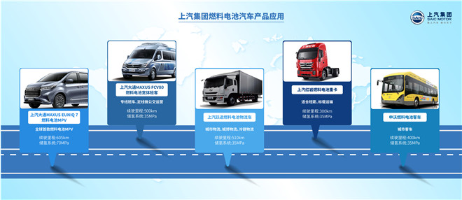 在簽約儀式現場,上汽集團旗下上汽大通MAXUS EUNIQ 7燃料電池MPV、上汽大通MAXUS FCV80燃料電池寬體輕客、申沃燃料電池客車、上汽紅巖燃料電池重卡、上汽躍進燃料電池物流車、捷氫科技燃料電池系統PROME P390一一亮相。這些產品都是上汽集團在燃料電池商業化方面的具體成果,相關車型商業化運營總里程已超過450萬公里。