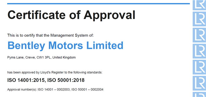 賓利汽車獲得最新 ISO 能源及環境管理體系認證