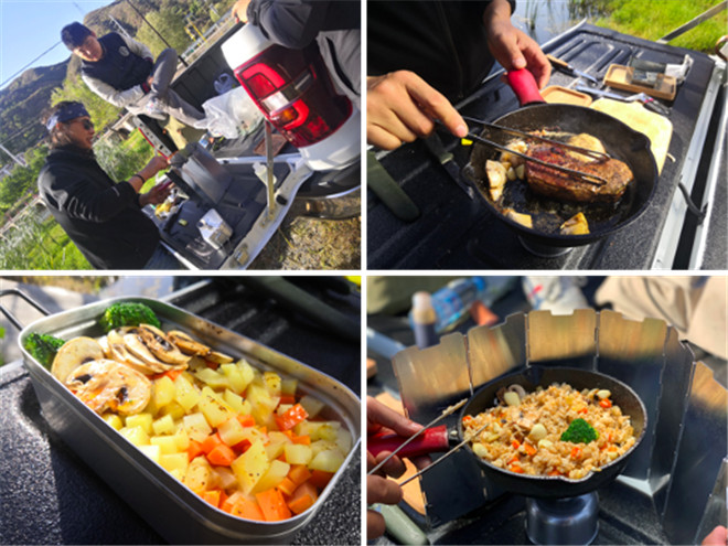 鑒于此,后貨箱蓋搖身一變成為了我們野炊的平臺(tái),也省去了支桌子的繁瑣。蒸米飯、煎牛排,以及餐后補(bǔ)上一杯純正的意式咖啡。這野餐規(guī)格也不算低了吧?牛排,野餐過(guò)程中最容易充饑并且做法最簡(jiǎn)單的精美食材,早上從冰箱中取出,放在保溫袋中一上午的功夫自然解凍,用鑄鐵鍋煎牛排再合適不過(guò)了。用小時(shí)候常見(jiàn)的鋁飯盒悶一盒米飯,再加上點(diǎn)菜,也是很有格調(diào)的簡(jiǎn)餐,只是沒(méi)把握好火候,水放少了,米飯格外的硬,解決辦法是用煎過(guò)蝦和牛排的油重新煎炒一下米飯,瞬間口感提升,味道融合了蝦油及牛肉香氣之后更鮮美了,這也算是誤打誤撞吧。
