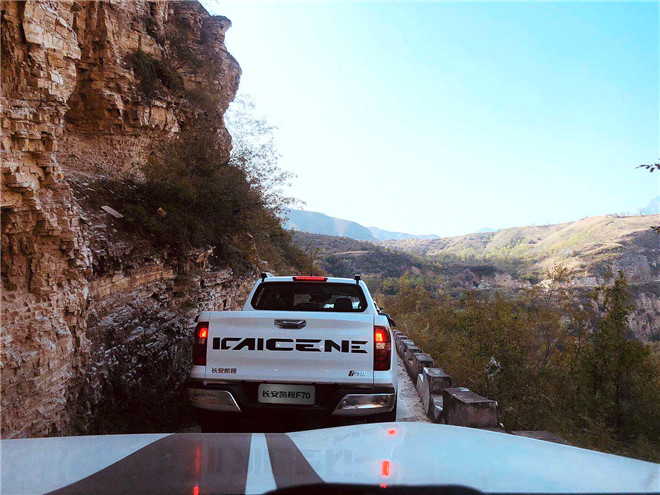 幽州峽谷路面狹窄,午后向官?gòu)d水庫(kù)穿越會(huì)車像家常便飯一般。如果是單獨(dú)一兩臺(tái)車還算好,如果是車隊(duì)遇車隊(duì),錯(cuò)車會(huì)如同噩夢(mèng)。我們?cè)诼飞闲羞M(jìn)著,我作為頭車盡量距離第二輛車稍遠(yuǎn)一些,如果有車隊(duì)會(huì)車,便于及時(shí)通知后車尋寬敞處避讓,如此一來(lái)也能避免堵個(gè)水泄不通。長(zhǎng)安凱程F70大皮卡相比同級(jí)別皮卡稍寬一些,車輛整體寬度達(dá)到1930mm。錯(cuò)車的時(shí)候開(kāi)啟360°3D高清全息影像,側(cè)向距離盡在掌握,即便沒(méi)有副駕也能輕松完成錯(cuò)車,相信越野穿越中的狹窄路段使用感受會(huì)更明顯。說(shuō)到這里,就不得不提10.25英寸大觸摸屏的另一項(xiàng)出色“技能”——搭載長(zhǎng)安最新的In-Call3.0智能系統(tǒng),當(dāng)下非常流行的互聯(lián)網(wǎng)影音娛樂(lè)、信息服務(wù)、安全保障等等功能它均具備,除此之外最令我滿意的一點(diǎn)是,這個(gè)車機(jī)系統(tǒng)流量終身免費(fèi),而且還可以通過(guò)藍(lán)牙與Wifi鏈接手機(jī),實(shí)現(xiàn)各種互聯(lián)網(wǎng)功能。