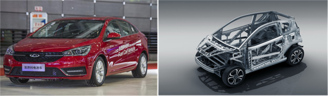 左圖為奇瑞氫燃料電池車、右圖為奇瑞已經應用的新能源全鋁輕量化車身技術