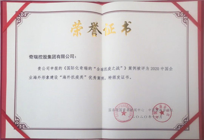 在此次獲得“中國企業(yè)海外形象20強”的同時,由奇瑞集團申報的《國際化奇瑞的“全球抗疫之戰(zhàn)”》案例,還被國務院國資委新聞中心評選為2020中國企業(yè)海外形象建設“海外抗疫類”優(yōu)秀案例。