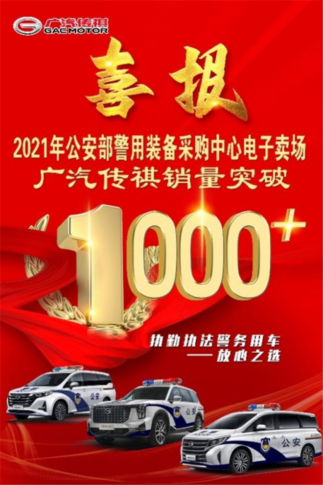 2022年1月10日,在我國第二個中國人民警察節到來之際,廣汽傳祺警務用車也傳來了喜報:廣汽傳祺在2021年公安部警用裝備采購中心電子賣場銷量突破1000+!