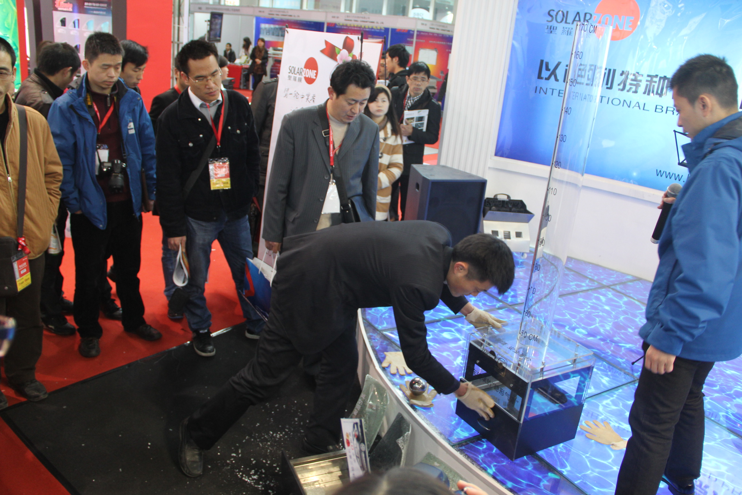 展會(huì)現(xiàn)場(chǎng),參展觀(guān)眾在全景專(zhuān)業(yè)技師的指導(dǎo)下,手握2.5公斤重的鋼球從1.5米的高度自由落體到兩塊分別貼有普通安全膜和酷思迪(Cold Steel)特種安全膜的4mm鋼化玻璃上。貼有普通安全膜的玻璃“輕松”擊穿,而貼有酷思迪(Cold Steel)特種安全膜的玻璃雖然出現(xiàn)裂痕,但酷思迪(Cold Steel)獨(dú)有的安全層和專(zhuān)利特種壓敏膠仍然將玻璃碎片牢牢的粘在膜上。連續(xù)三次的砸擊絲毫沒(méi)有砸穿酷思迪(Cold Steel)特種安全膜,也將會(huì)場(chǎng)推向了高潮。體驗(yàn)過(guò)后,現(xiàn)場(chǎng)觀(guān)眾紛紛對(duì)源自以色列哈尼塔(Hanita Coatings)的特種安全膜贊不絕口。