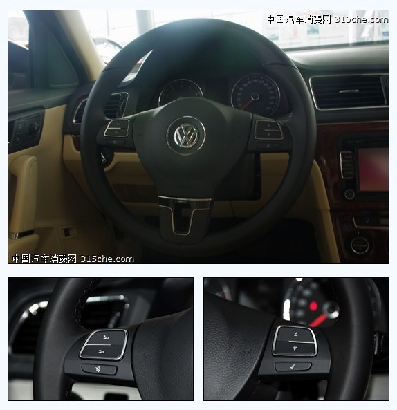 真皮包裹的三幅式方向盤采用與新款帕薩特相似的設(shè)計,真皮包裹并配有音量調(diào)節(jié)和藍(lán)牙功能,多功能按鍵手感有點(diǎn)偏澀。另外,方向盤只能進(jìn)行手動兩向調(diào)節(jié),正常身材的駕駛者都能找到適合自己的坐姿。